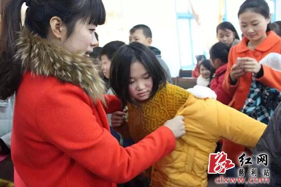 活动现场,孩子们在志愿者的帮助下试穿新棉衣,脸上露出快乐的笑容。爱心人士省人大代表、金色童年美语幼稚园园长吴菊在活动现场深情地与学生拥抱,给地处偏远高寒的洞溪乡学生送去美好的祝福,表示会为改善山区的办学条件尽最大努力争取多方支援。团县委书记唐甜鼓励学生树立乐观向上的生活态度,在困境中奋发图强,并引用名言“仰望星空,脚踏实地”与学生共勉。