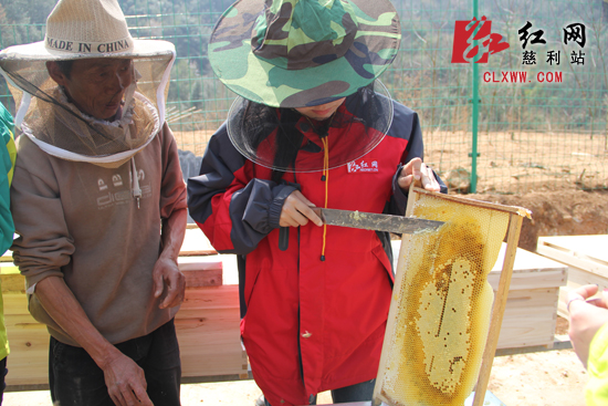 菜足饭饱的我们一点都闲不住,听说这里养着蜜蜂,赶紧戴着“防蜇帽”进到基地瞧瞧。一看才知道,蜂农们小心翼翼地揭开蜂箱,切割封盖,小心翼翼地用手工甩蜜,忙活半天,好几箱的蜂巢才得到一点点的蜂蜜。小编也拿着刀尝试割蜂胶,因为没有掌握要领,不小心将蜂蛹切到,无意中杀死几个小生命,心中顿生懊恼。还好戴总不怪小编,还给我们切蜂巢吃鲜蜜,这真是小编吃过的最新鲜的蜂蜜呢,嘴上和心里的那个甜滋滋,真是无法形容!