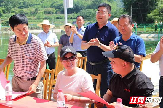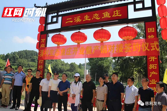 红网时刻慈利6月11日讯(通讯员 朱晓敏)6月10日,县委副书记舒洪波利用周日来到联系点二坊坪镇二溪村,组织驻村工作队后盾单位、二坊坪镇政府及村支两委与湘澧家缘、菜逢缘、唐记鱼杂等3家本土餐饮企业共同考察和签订了二溪村生态渔庄集体经济产销对接协议,助力全村贫困户稳定脱贫持续增收年年有余。
