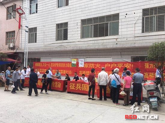 此次活动共有综治办、禁毒办、安监站、司法所等十二个部门参与,在镇街道上人流密集处设置了宣传台,各部门安排专业宣传员,采取悬挂横幅、发放宣传单、政策宣讲、知识问答等多种形式开展此次宣传活动,将当前形势下的扫黑除恶、禁毒、征兵、安全生产、消防、防灾减灾等多项工作进行了深入宣传。
