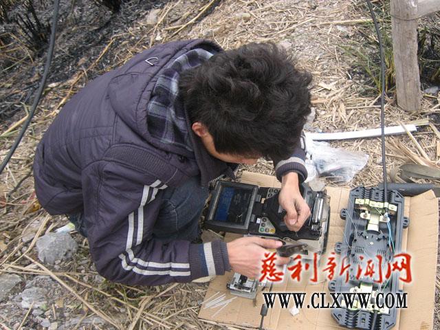 被烧断的近200米光缆,是由岩泊渡经失马往宜冲桥方向的有线电视干线传输网,担负着整个宜冲桥乡的有线电视信号传输任务。由于光缆损毁严重,工作人员只好将烧断的光缆从电线杆上一根一根的剪断,然后重新对光纤进行熔接。整个熔接工作从早上10点多钟开始,一直到下午3:30分左右,经过4名工作人员的紧张忙碌,中断了近5个小时的有线电视信号才得以恢复正常。