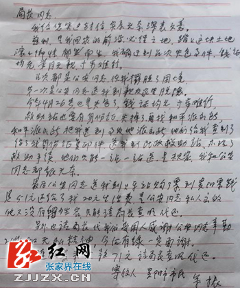 在余振的信中,他满怀深情的叙述了自己在慈利的一段难忘经历。当时他正途经慈利返回贵州老家,不小心将携带的包丢失,钱和证件全部在包里。身在异乡无亲无靠,幸运的是,他在“和平派出所”(后经证实,慈利县根本没有这样一个派出所,可能是余振记错了该派出所的名字。)办理临时身份证时得到一名好心民警的倾情相助,自掏腰包,帮助购买了回贵阳的火车票,还提供了在火车上就餐的伙食费。余振在信中还介绍,整个过程,这名民警都没有透露自己的姓名。此次余振一并寄来的还有一张额度为71元的汇款单,这是还给这名民警帮助其购买火车票和车上就餐的钱。