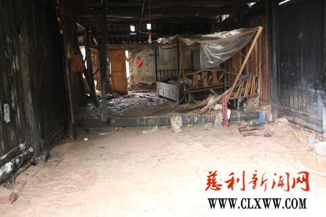 陈云官老人家的房子只剩下一半,木板墙上洪水冲痕依然清晰可见