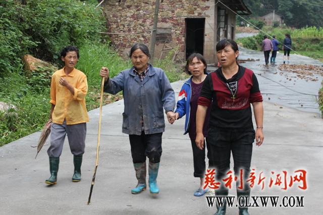 家徒四壁的孤寡老人佘桐英在村民搀扶下走向灾民安置点