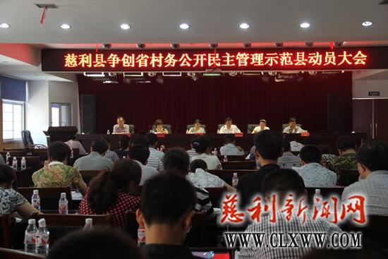 慈利新闻网讯(通讯员 李依娟 向胜男)7月8日上午,我县争创省级村务公开民主管理示范县动员大会在建新宾馆会议室召开。市民政局领导唐纯志,县领导陈艳静等出席会议。会议总结了2013年村务公开工作,安排部署了2013年村级民主管理创建工作,动员各乡镇和成员单位扎实推进各项工作,为争创 “省级村务公开民主管理示范县”创造有利的条件。
