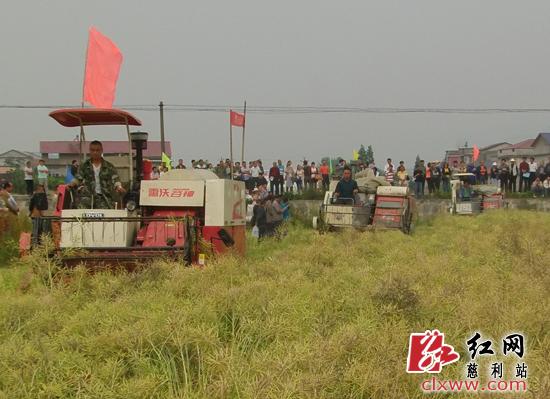 5月7日,慈利县在岩泊渡和平村成功举办油菜机械化收割现场演示会,慈利县生安农机作业专业合作社负责人汤喜文一边看着现场演示,一边给大家算账,细数油菜全程机械化的好处。