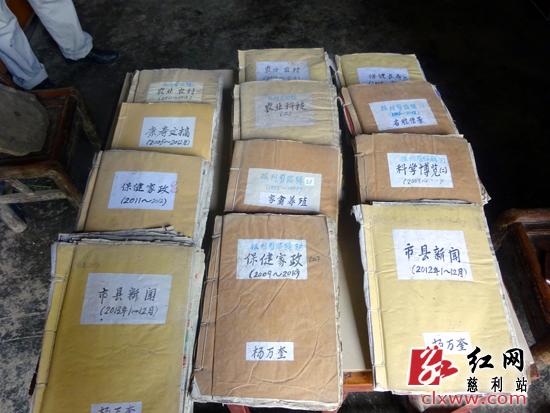 说是阅览室,其实就是自家客厅,规模不大,却处处透露着良苦用心。客厅一角老式玻璃橱柜里整整齐齐地码着购买的书籍,橱柜上二十几本厚厚的书包装简陋,乍一看灰头土脸的,走近翻翻才知道这些都是杨老自制,用报纸、杂志上剪下的新闻、信息、故事粘贴在本子上,装订成册,分类集整成书,涵盖市县新闻、农业科技、保健家政、家禽养殖等多个方面。客厅另一边的沙发上方,用报纸夹夹着几排最新鲜的报纸。