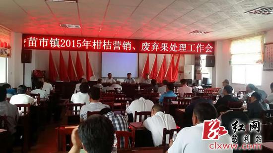 慈利新闻网9月15日讯(通讯员 柴小辉)9月14日,苗市镇柑桔营销、废弃果处理工作会议召开。会议的主要任务是总结2014年度柑桔营销工作,安排部署2015年度柑桔营销任务,镇长吴辉主持,柑桔协会会长杨仁清作柑桔营销工作报告,农业局领导、农技站长、各村支部书记及柑桔打蜡厂(柑橘收购点)负责人80余人参加了会议。