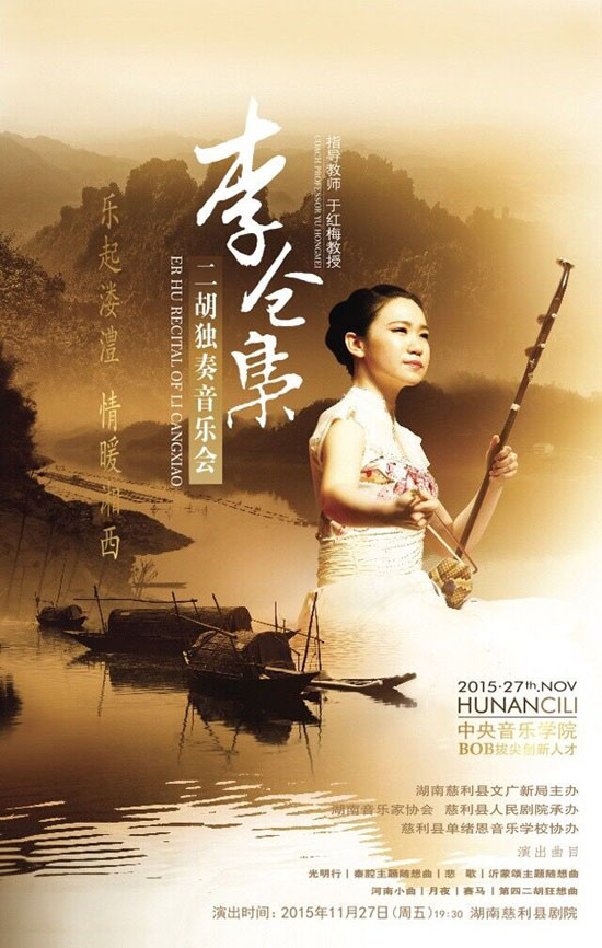 慈利新闻网11月25日讯【记者 杨玥妙楠】11月27日(本周五)晚19点,将在慈利剧院举行中国青年音乐家李仓枭的二胡独奏音乐会,让慈利人民免费欣赏到中国传统高雅艺术。