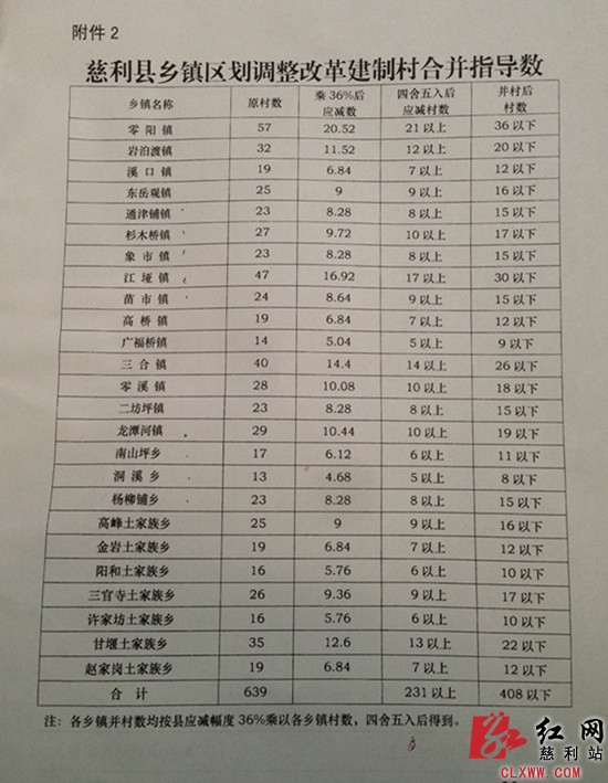 会议明确,慈利县的乡镇区划调整并村工作将按照省委、省政府和市委、市政府总体要求,立足县情实际,以“精简、效能、统一”为目标,按照优化布局、规模适度、有利发展的要求,全县建制村在639个的基础上,减少231个以上,减少幅度不低于36%,建制村合并工作从2016年2月下旬全面启动,6月中旬前全面完成。