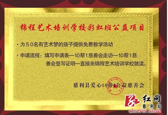 锦程艺术培训学校校长向勤说,彩虹班志愿者服务成立后,将由锦程免费提供场地和教学设施,学校免费招收社区周边家庭条件相对困难且爱好艺术的中小学生;培训时间为每周日上午,首批入学者约50人。想加入培训班的孩子,可直接到爱心10帮1慈善会申请。