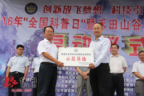 启动仪式上,市县领导为禾田居山谷授予了“张家界市科普教育基地”牌匾、“慈利县休闲农业科普示范基地”牌匾。据了解,2016年全国科普日活动主题是“创新放飞梦想、科技引领未来”, 旨在通过开展系列活动,宣传新理念,普及新知识,推动新发展。在今年系列科普活动中,慈利县将组织相关单位陆续开展送医送药下乡科普宣传、科普大蓬车进社区进学校进农村、社区科普大讲堂等活动。