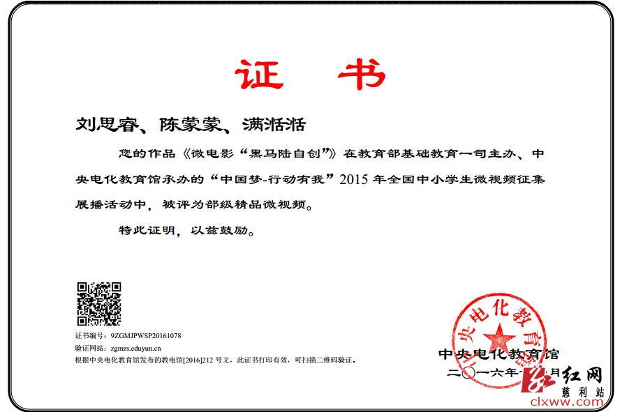 红网慈利分站12月23日讯(通讯员 满金平)12月22日,由国家教育部基础教育一司主办,中央电化教育馆承办的“中国梦—行动有我”2015年全国中小学生微视频征集展播活动评审结果揭晓,慈利县一完小微电影作品《黑马陆自创》杀进全国决赛,驮回此次活动最高奖项“部级精品微视频奖”,杨昌立校长、莫丽慧老师等荣获“部级最佳指导奖”。