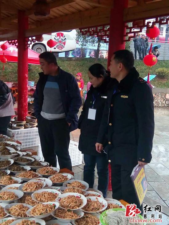 红网慈利分站12月26日讯(通讯员 卓少民)12月24号,慈利县市场和质量监督管理局的执法人员来到南山坪乡福寿文化旅游节活动现场,对村民售卖的农副产品和餐饮进行了检查。