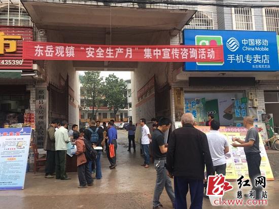 这是东岳观镇政府在“安全生产月”内开展的一次集中宣传咨询活动,以“落实企业安全生产主体责任”和“深化安全监管执法年”为主题,立足于群众生产生活实际,着力加强相关单位和群众的安全红线意识。
