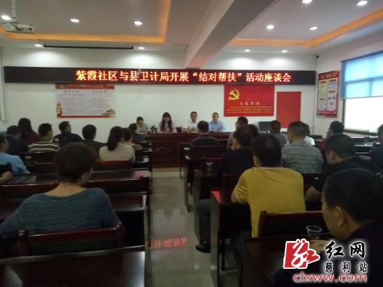 县卫计局的在职党员们全体来到紫霞社区开展“结对帮扶”活动座谈会,并把困难群众请过来,与他们面对面建立结对关系,互相之间了解情况,并表示今后帮扶对象需要帮助可随时打电话或者直接到局里去,一定会尽力帮助他们,并在他们送来中秋、国庆节来临之际,祝他们节日快乐、家庭幸福。