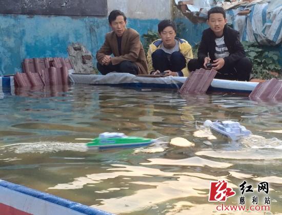 水泥砖砌围栏,塑料油布打底,再灌满水,就是孩子们的练兵场,只见“船长”手持遥控器,紧紧盯着船模,凝神屏气,小心翼翼地操作着。启动、出发,前进,转弯,冲刺……一连串的动作在“船长”的手下一气呵成,引得围观学生们忍不住连连赞叹。突然,一个急转弯,球没控制住,被“激流”冲出了轨道……围观的学生急了起来:“快!快!快拦住它!”“船长”像是见惯了“大场面”,倒是泰然自若,不慌不忙地迅速操作按钮,几个转身将球又重新推上。船儿又重新航行在“大海”里……精彩的训练引得师生驻足观看,满满的热情洋溢在简陋的训练场上。