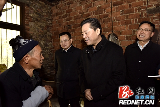 2017年12月31日,张家界市委书记、市人大常委会主任虢正贵(中)在桑植县桥自弯镇三和村调研脱贫攻坚。