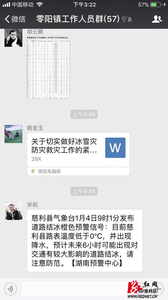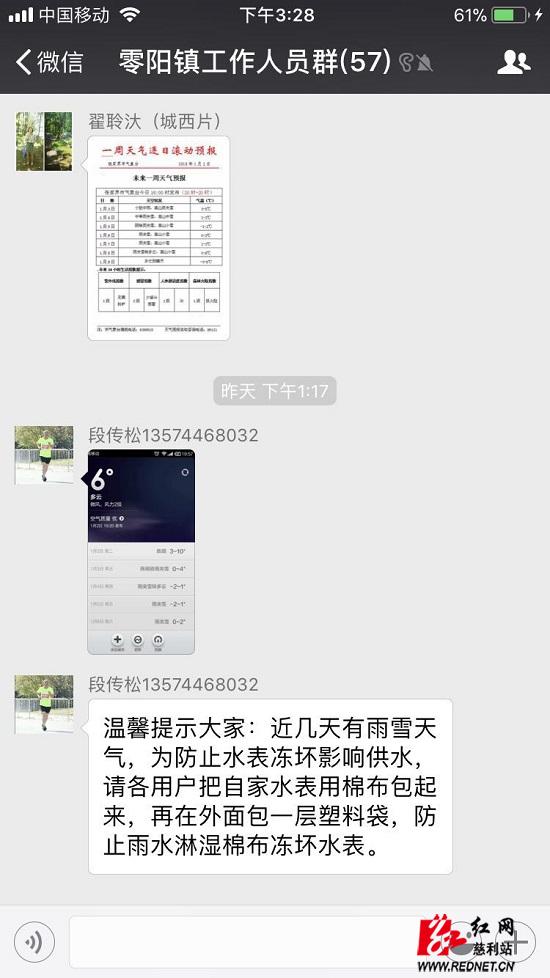 微信群里见真情——零阳镇的工作微信群里发布着许多温馨提醒,有提醒注意交通安全的,有提醒注意实时天气的,还有提醒注意用水安全的等等,只言片语都传达出了大家共同防范灾害发生的决心。