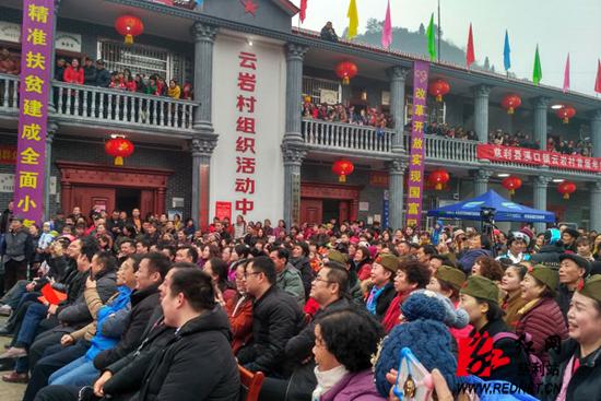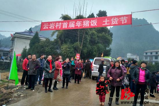 上午9点,云岩村已是人头攒动,热闹非凡,首届年猪饭、土货节活动在云岩村村民们自编自演的舞狮、舞蹈、渔鼓等节目中展开。会场外,村民自家的土家腊肉、腊香肠、糍粑等土特产品,早在村道两边摆好,供大家选购,企业家们纷纷解囊购买土特产品。中午,大家同吃长桌宴,享受乡村传统美食。