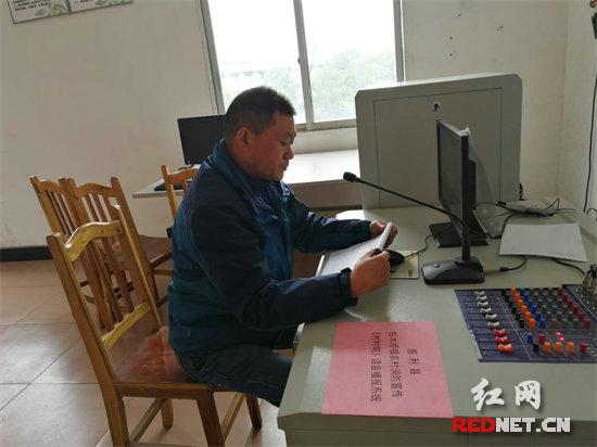 杉木桥镇广播员在广播室播放广播稿