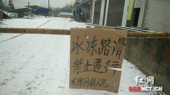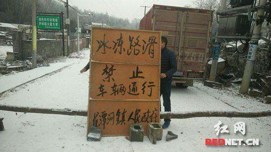龙潭河镇政府干部徒步各陂段险情易发生的交通路段,能通行的设立“雪天路滑 谨慎驾驶”标志牌或设立禁止通行标志牌,目前,龙潭河至金坪、金坪至朝阳、金坪至南山坪、金坪至云朝山赏雪景路段已设立“冰冻路滑、禁止通行”警示牌及路障。