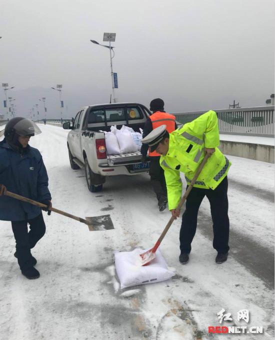该镇交警队还自发组织全体干部在集镇范围内的交通主干道、人行道上进行积雪清扫工作,并在岩泊渡大桥上实行“撒盐除冰”,效果立竿见影。快速解除了路面冰冻的危害,减少了降雪对交通运输、群众正常出行的困扰,并确保了镇域内道路畅通。