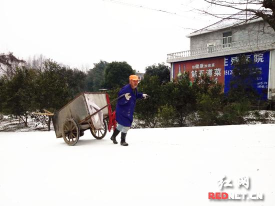 —分享— 红网时刻慈利1月29日讯(通讯员 朱雪帆)1月27日,慈利迎来降雪。天气寒冷,最佳的选择应该是留在家中取暖,然而,在零阳镇铁桥村的雪地里却有一抹亮眼的橘色。 这一抹橘色,是一名党员戴着的红帽子。这名党员名叫王春生,今年68岁,是一名垃圾清运工,拖着垃圾车,在雪地里一步步艰难地行走着。 寒冷的风雪天,这名垃圾清运工依然坚守岗位,为村容村貌干净整洁而任劳任怨、默默无闻地付出。 来源:红网慈利站 作者:朱雪帆 编辑:redcloud 本文为慈利新闻网原创文章,转载请附上原文出处链接和本声明。本文链接:https://www.clxww.com/content/2018/01/27/7722154.html