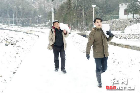 红网时刻慈利1月29日讯(通讯员 胡建 邢倩)1月27日,龙潭河镇已经连着下了三天的大雪,整个乡镇到处都是白茫茫的一片,此时此刻,却有这样一群人在大山深处的雪地上留下了一串串清晰的脚印,他们就是龙潭河镇竹峪村的村支两委干部及帮扶单位省社会主义学院的干部。