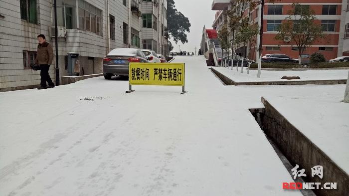 从昨天起,气温骤降,大雪纷飞,公路上几乎看不到车子和行人。因恶劣天气的影响,义务教育阶段师生已提前放寒假,但高中因为学业任务重又多寄宿生,学生仍在校坚持学习。为了保障师生冰雪天的安全,学校领导班子没少想法子。例如特别召开学校行政、各年级组和班主任会议,强调在恶劣天气多对学生进行细致有效的安全教育和关怀;在食堂、宿舍、教室、实验楼等关键地方竖立警示牌;在学生上下课关键时段,有学校领导站在关键位置,提醒注意安全并指导怎么安全行走;等师生进教室了,又不定时地组织专门人员,对几条关键校道,进行撒盐化雪,扫雪铲雪等工作。