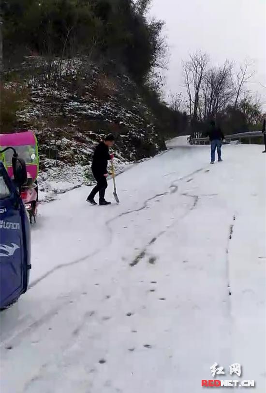红网时刻慈利1月29日讯(通讯员 朱雪帆)大雪纷飞,道路结冰,给道路交通带来极大不便和安全隐患。1月27日上午,在零阳镇笔架村,年轻党员们正在积极撒盐除冰。