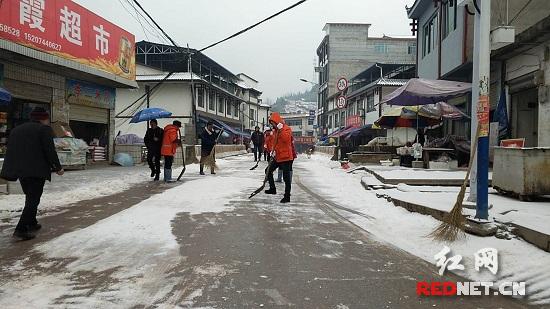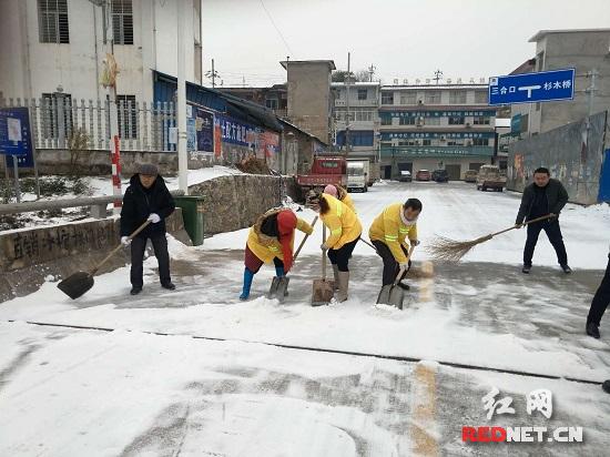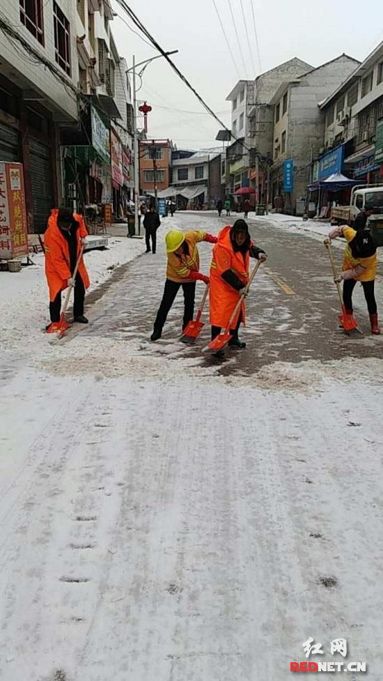 1月27日上午9时许,全县20个乡镇环卫所同时行动,干部职工齐上阵,顶着严寒、踩着湿滑的冰面,开始了除雪行动。前面的工人往道路上洒工业盐,后面的工人就用铲子敲碎冰块,用扫帚清扫积雪,还有的工人在清理道路垃圾,配合政府部门的工作人员引导交通。