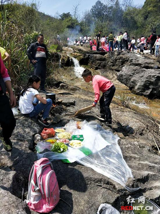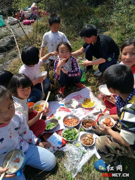 上午10点整,随着校园广播声响全体师生集合完毕,开始了令学生们很兴奋的踏春之路。到达目的地后学生们开始分组寻找柴火,为中午的午餐做准备。在准备的过程中,孩子们愉快的嬉戏,天真烂漫,让在场的家长也感受到了童年的欢乐!通过孩子们及家长的协助努力,野炊午餐正式开始。大家吃的很开心,也因为是自己努力而亲手做的食物,而吃的更带劲!