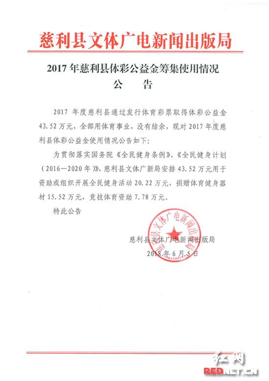 2017年度慈利县通过发行体育彩票取得体彩公益金43.52万元,全部用体育事业,没有结余,现对2017年度慈利县体彩公益金使用情况公告如下: