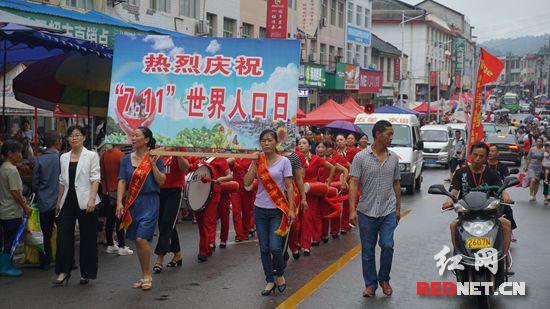红网时刻慈利7月3日讯(通讯员 吴志华 杜爱军)7月3日,慈利县龙潭河镇利用场集开展以“关心女性幸福,关爱妇幼健康”为主题的“7.11”世界人口日宣传游行活动,巨大的展板、铿锵的鼓声,吸引无数过往行人驻足观看。