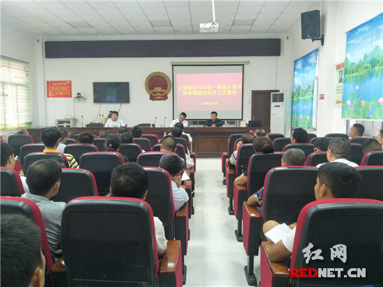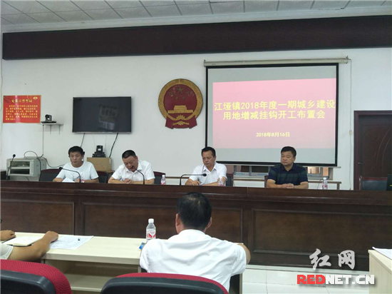 红网时刻慈利8月16日讯(通讯员 杨锋)根据县城乡建设用地增减挂钩工作领导小组办公室《关于2018年一期城乡建设用地增减挂钩项目开工通知》文件精神,8月16日上午,江垭镇政府迅速动员,积极发动,召开城乡建设用地增减挂钩开工布置会,部署增减挂钩拆旧复垦项目开工事宜。28个涉及村支两委、18个标段施工单位、国土所、城建站相关单位负责人参加会议。