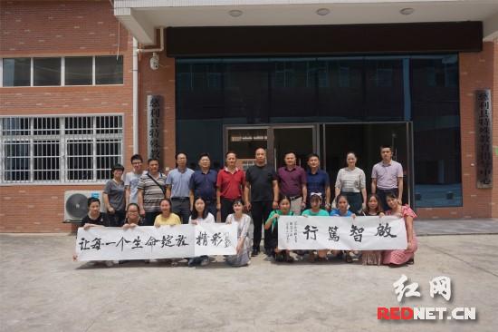 艺术家们首先参观了学校,深入了解慈利特校的发展情况,对特校老师从事残疾儿童教育工作给予高度的赞许。随后,艺术家们挥毫泼墨,围绕“关爱特殊儿童”这一主题创作了10余副书法作品,饱含对“特殊儿童”和特校发展的美好祝福,更寄予了对特校老师“启智笃行”的无限期冀。