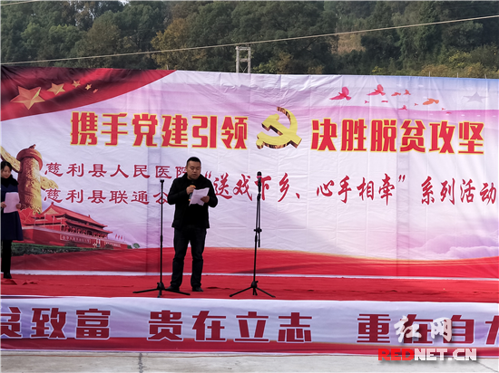 红网时刻慈利11月22日讯(通讯员 杨戈)在慈利县脱贫攻坚“百日冲刺”的关建时期,11月22日上午,慈利县人民医院与慈利县联通公司在江垭镇李家峪村联合开展了“送戏下乡、心手相牵”系列活动,以此丰富李家峪村的精神文化生活。