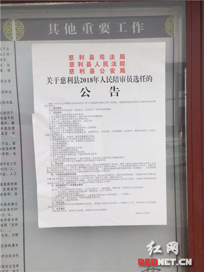 红网时刻慈利12月11日讯(通讯员 杨戈)近日来,江垭镇积极落实2018年度人民陪审员选任工作,组织各村(居)委员会、镇直单位学习下发选任工作宣传资料,在集镇及各村(居)委员会告示栏张贴选任公告,为完成人民陪审员选任工作奠定了良好的基础。