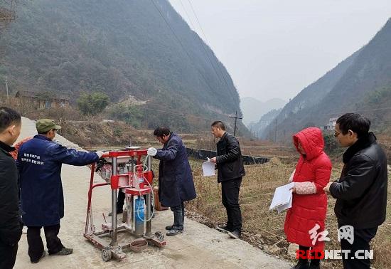 验收小组一行先后来到月亮岩村、牧羊冲村、枫香坪村、望月坪村等11个村,实地查看道路建设完成情况,对新建道路的长度、宽度进行仔细测量,通过打孔检测、抽芯检测等方式重点检查了道路硬度。经验收,11个村自然村道路建设全部验收通过。