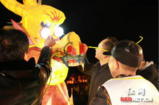 慈利县文体广电新闻出版局局长周小焯、龙潭河镇党委书记向平华正在为龙点睛