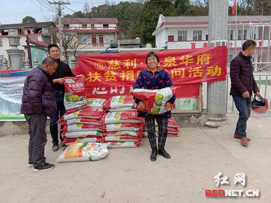 红网时刻慈利3月12日讯(通讯员 吴志华)3月12日,张家界东升置业有限公司慈利.温泉华府负责人一行来到慈利县龙潭河镇水坪村为贫困群众捐赠肥料,助力精准脱贫。