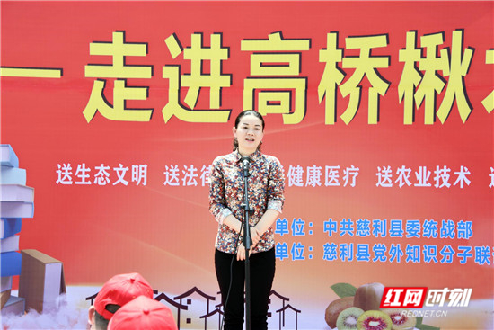 “弘扬爱国奋斗精神,建功立业崭新时代”、“发挥党外知识分子作用,携手共建同心美丽乡村”,一幅幅红色的标语把今日的楸木山村部妆扮得喜气洋洋、多姿多彩!在“知联溇澧——走进高桥楸木山”活动开幕式上,高桥镇党委书记李经雄代表高桥镇党委政府致欢迎词,县委统战部副部长姚伟介绍了慈利县党外知识分子知联会成立和活动情况:党外知识分子是一支强大的队伍和重要的力量,为充分发挥这支队伍的重要作用,慈利县于2018年1月成立了党外知识分子联谊会,选举产生了知联会会长、副会长、理事,目前有理事71名,各位理事都是各条战线各个单位各领域各团体具备中级以上职称有特长有影响的党外专家学者和专业人士,知联会设立了党外知识分子工作站,建立了组织建设部、参政议政部、社会服务部、秘书处“三部一处”工作机制,从而使全县党外知识分子从此真正有了一个温馨的“娘家”。县委常委县委统战部长戴必欣发表了热情洋溢的讲话。她指出:慈利知联会成立还只满一岁,还只是一株嫩幼幼的小苗,通过社会各界阳光雨露的滋润培育,这棵小苗必将成为广袤天地一棵枝叶茂盛、体态丰腴、妸娜多姿、人人青眛的常青树!她热诚希望知联会能把全县党外知识分子广泛团结凝聚在党的周围,担负起学习教育、培养人才、建言献策、服务社会、联谊交友五大职能,打造好联谊交会 、参政议政、共同成长三个平台,发挥出桥梁纽带、参谋智囊、服务大局三种作用,使知联会真正建起来、转起来、活起来,为慈利经济社会高质量发展广泛聚心聚力聚智,奉献真诚真心真情,在溇澧大地建功立业、奋发出彩!她殷切期望楸木山这个同心美丽乡村撸起袖子加油干,和着新时代乡村振兴的节拍不断有新作为创新业绩展新风貌,着力聚焦生产、生活、生态和谐统一,抓住产业兴旺这个重点,生态宜居这个关健、乡风文明这个保证、治理有效这个基础、生活富裕这个根本,使同心美丽乡村更美丽、更亮丽,勇跃成为慈利、张家界乃至湖湘大地一颗熠熠生辉的乡村明珠!愿楸木山的村民明天更和谐!更幸福!更快乐!更美好!