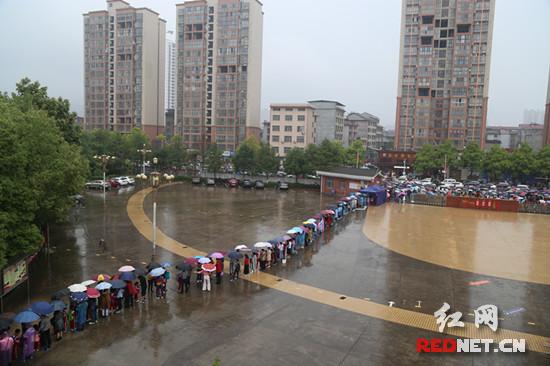 带着这种种疑虑和问题,该校第一时间启动疫情防控应急预案,迅速组织召开紧急会议,商情和安排放学事宜。经再三考虑,学校决定让班主任和辅导员留在教室,组织学生放学;其他教师赶到校园广场,一个一个地接龙撑伞,专门辟出一条隔雨带,供学生通行。
