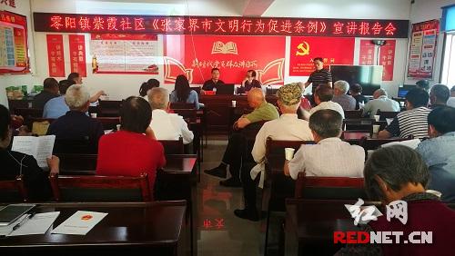红网时刻慈利5月18日讯(通讯员 于璐)为进一步提升文明素质,弘扬社会正能量,认真抓好学习宣传和贯彻落实《张家界市文明行为促进条例》工作,进一步引导全体党员深入领会精神,践行文明行为。5月18日下午,零阳镇紫霞社区邀请县委宣传部李举平同志宣讲《张家界市文明行为促进条例》,此次活动共70余人参加。