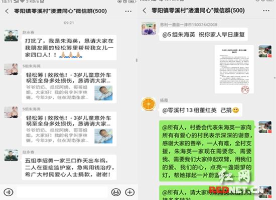 一人有难,全村支援。得知此事后,村委会第一时间在“零溪村溇澧同心微信群”里发出捐款倡仪书,号召全村村民为朱某英家捐款并同时转发轻松筹链接。微信群里村民收到村委会发出的倡议书及筹款的链接之后,一时间,“零溪村溇澧同心微信群”里滴哒的声音此起彼伏,大家纷纷慷慨解囊并积极转发到各自的朋友圈及微信群,同时,祝愿朱某英的家人早日康复。涓涓爱心汇集成流,一份份捐款记录表达的不仅仅是爱心,更传递出希望朱海英的家人早日康复的迫切愿望。