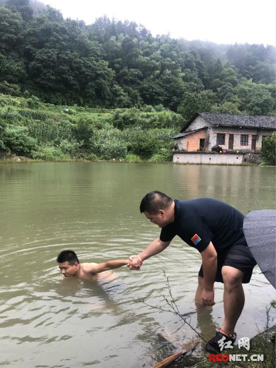 直到7月8日凌晨3点,虽然雨势暂减,但是防汛防地质灾害巡察工作依然还在进行;7月8日上午11点,副乡长全映融、退役军人服务站站长胡鑫、咸水村党支部书记邓子信一行到辖区内开展巡察,邓子信更是冒险下水为12组山塘水库疏通涵洞。