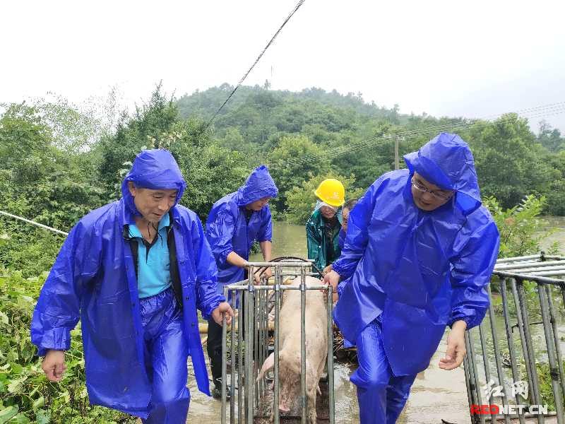 救援工作从上午8点半直到下午3点才结束,共抢救转运牲猪72头。从养猪场到安全公路上约1公里,途经丛栊和水塘,水塘被淹,不能通行,水面宽约300米,抢险队用树木撬成木排,将牲猪一个一个渡运过来再抬上安全公路。