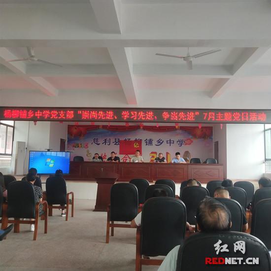 红网时刻慈利7月9日讯(通讯员 杨晖)“我志愿加入中国共产党……”,一声声铿锵有力的入党誓词在杨柳铺乡中学会议室响起。7月9日上午,杨柳铺乡中学举行“崇尚先进,学习先进,争做先进”主题党日活动,全体党员教师参加。
