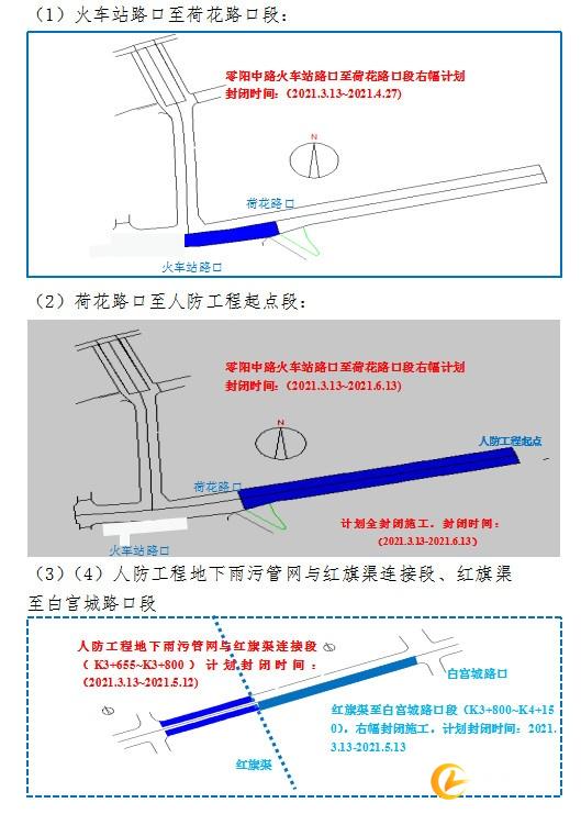 (2)荷花路口至人防工程起点段(K2+100~K2+650),全封闭施工,封闭时间:2021.3.13-2021.6.13(共93天)。